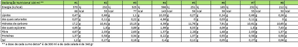 Cada Sumo contém 300 ml, Cada Salada contém 280 gr