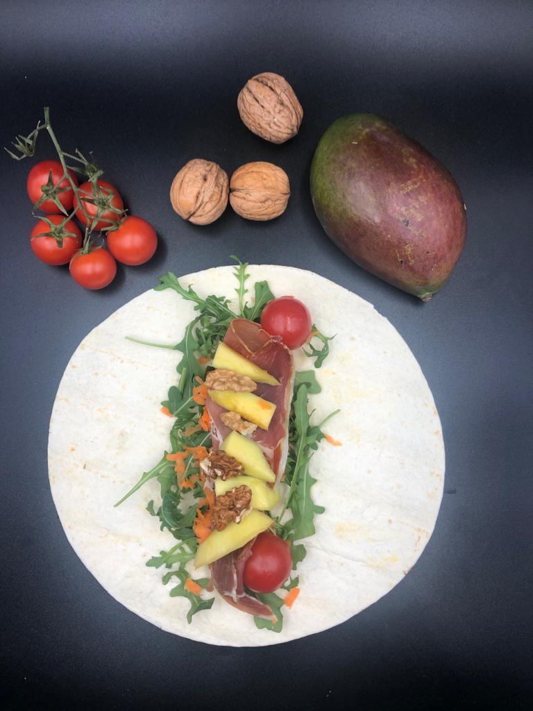 Ingredientes: Presunto, manga, nozes, cenoura ralada, tomate cherry, alface, rúcula
