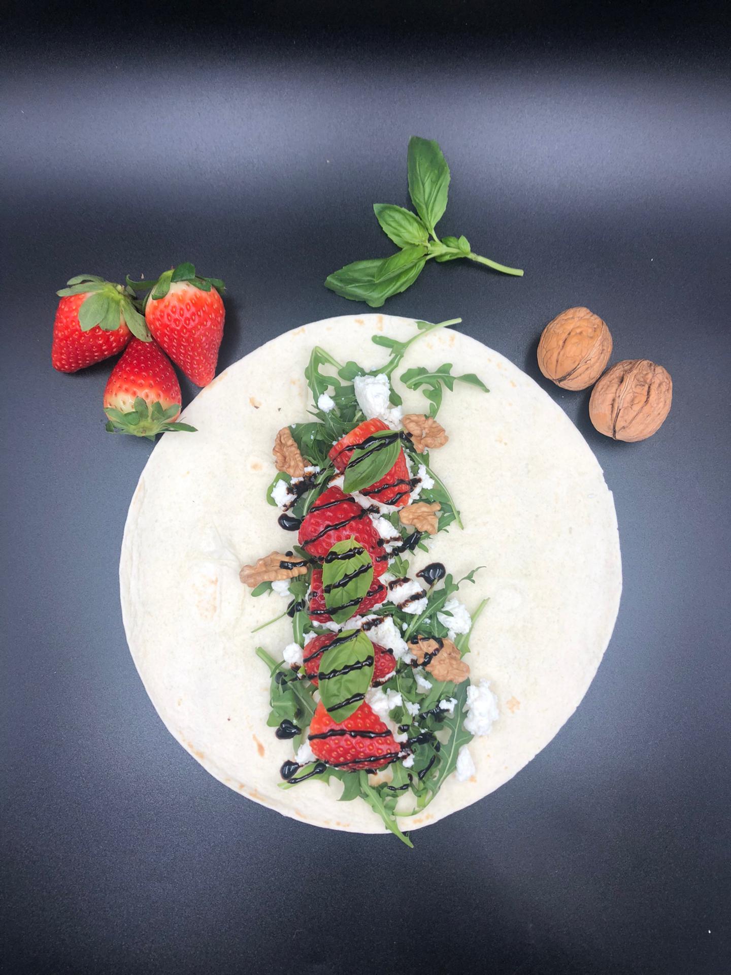 Ingredientes: Requeijão, morangos, manjericão, nozes, alface, rúcula