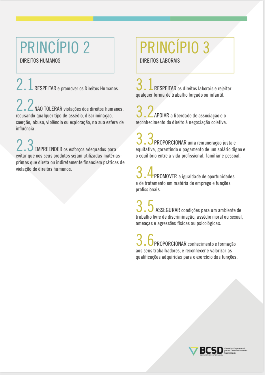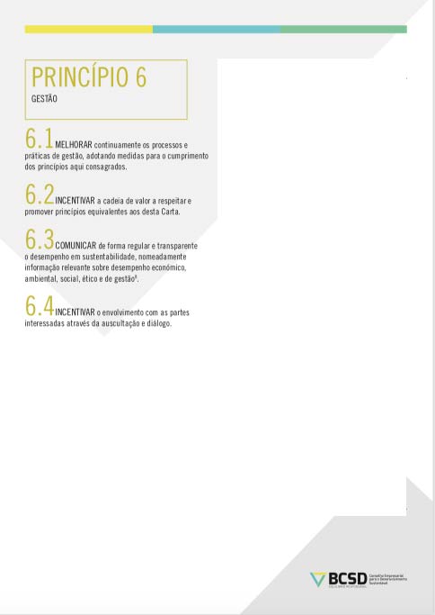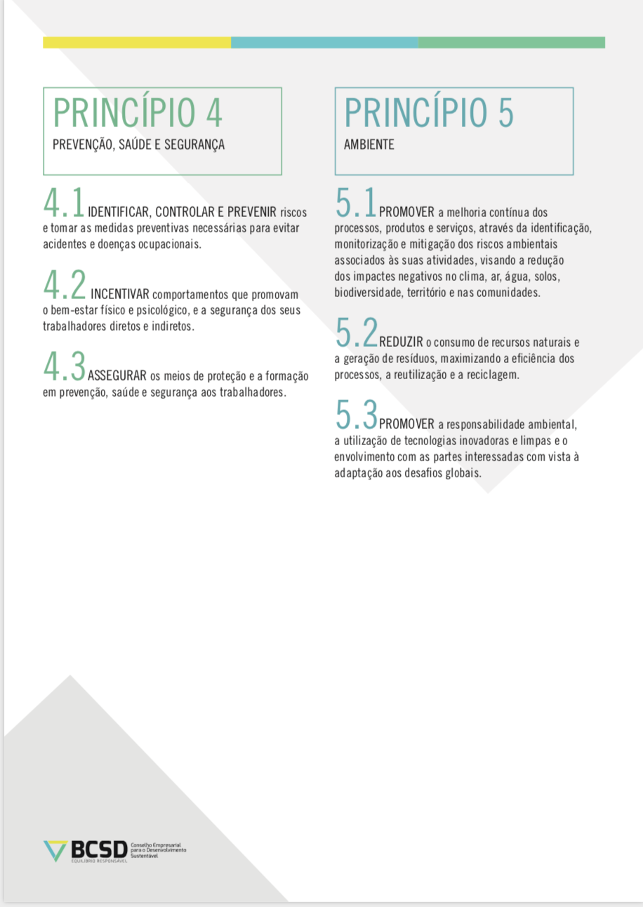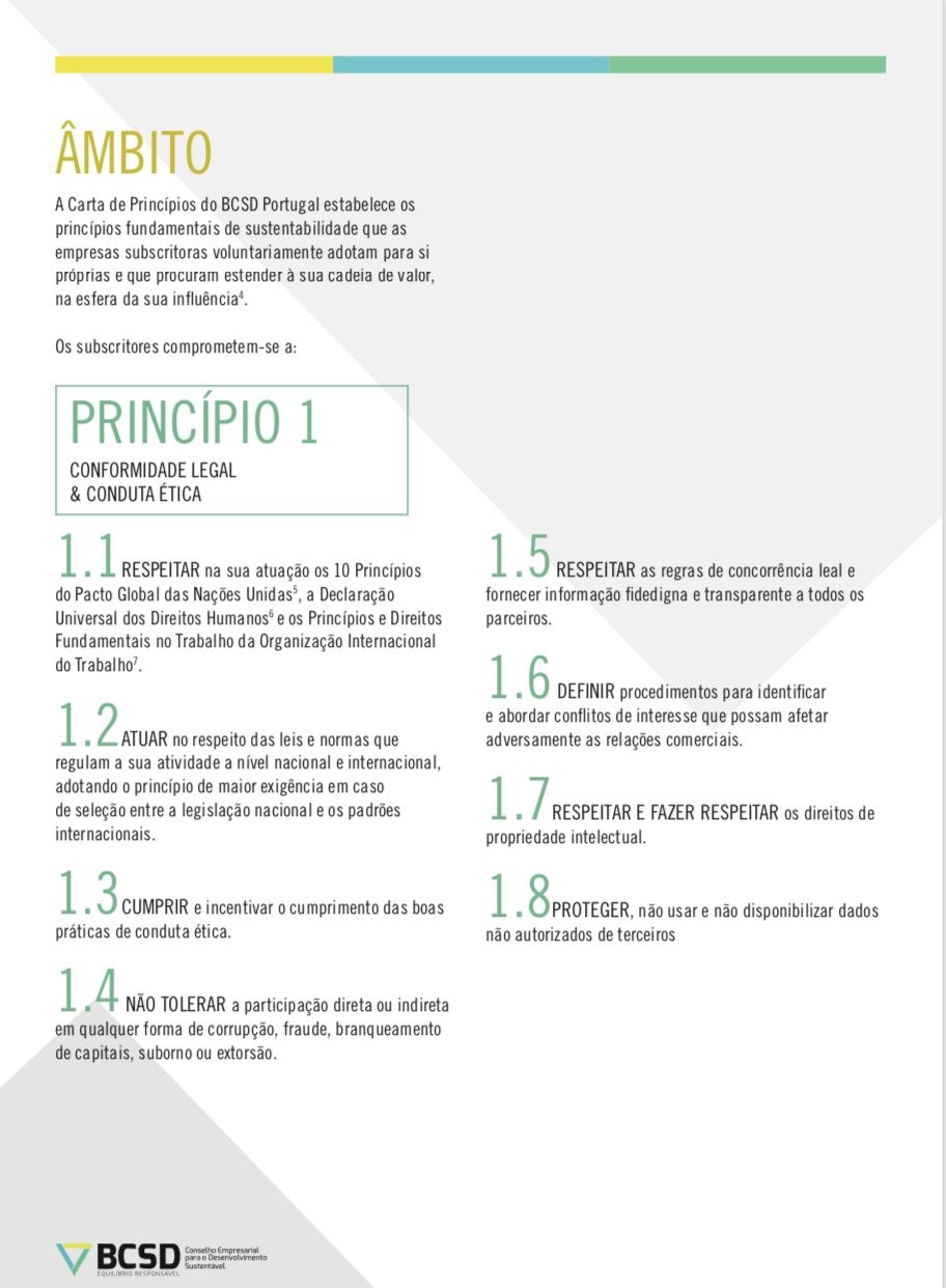 A Carta de Princípios do BCSD Portugal estabelece os princípios fundamentais de sustentabilidade que as empresas subscritoras voluntariamente adotam para si próprias e que procuram estender à sua cadeia de valor, na esfera da sua influência.